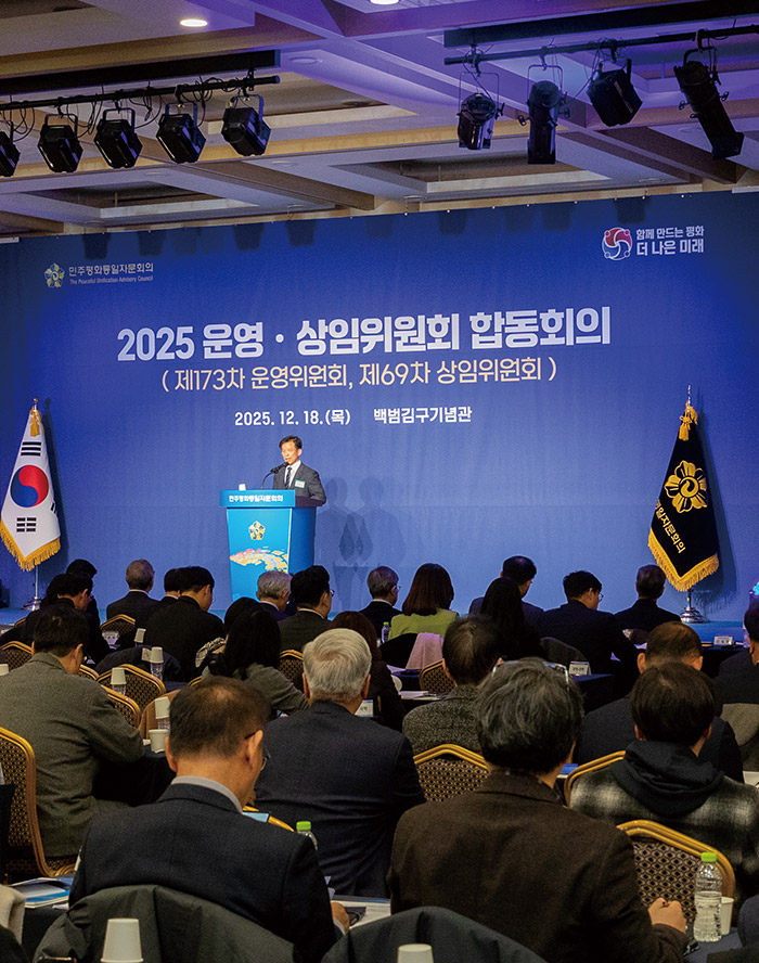 스페셜 테마 의장 메시지 남과 북이 함께 누리는 ‘코리아 프리미엄’ 리포트 숨 가쁘게 달려온 ‘국민주권정부’ 2025 제22기 출범회의 화보로 보는 ‘제22기 민주평화통일자문회의 출범회의’ 신년인사 이해찬 | 민주평화통일자문회의 수석부의장 방용승 | 민주평화통일자문회의 사무처장