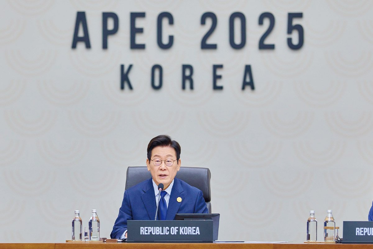 이재명 대통령(민주평화통일자문회의 의장)이 APEC 정상회의 세션1에서 개회사를 하고 있다.