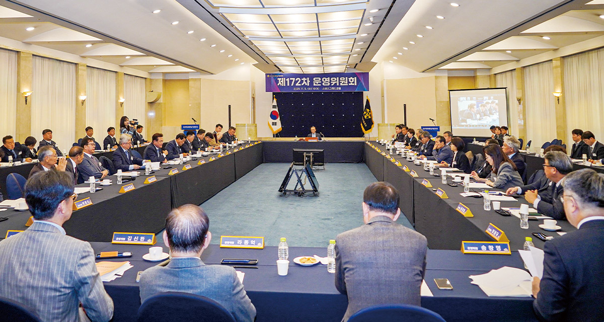 제22기 민주평화통일자문회의 출범 이후 첫 운영위원회인 ‘제172차 운영위원회’가 11월 5일 스위스그랜드호텔에서 열렸다. 운영위원회는 민주평통 운영에 관한 제반 사항을 결정하는 의결기구로 수석부의장과 부의장, 상임위원회 분과위원장, 직능 운영위원 등으로 구성되어 있으며, 이번 회의는 운영위원 50명 중 44명이 온·오프라인으로 참석한 가운데 개최됐다.