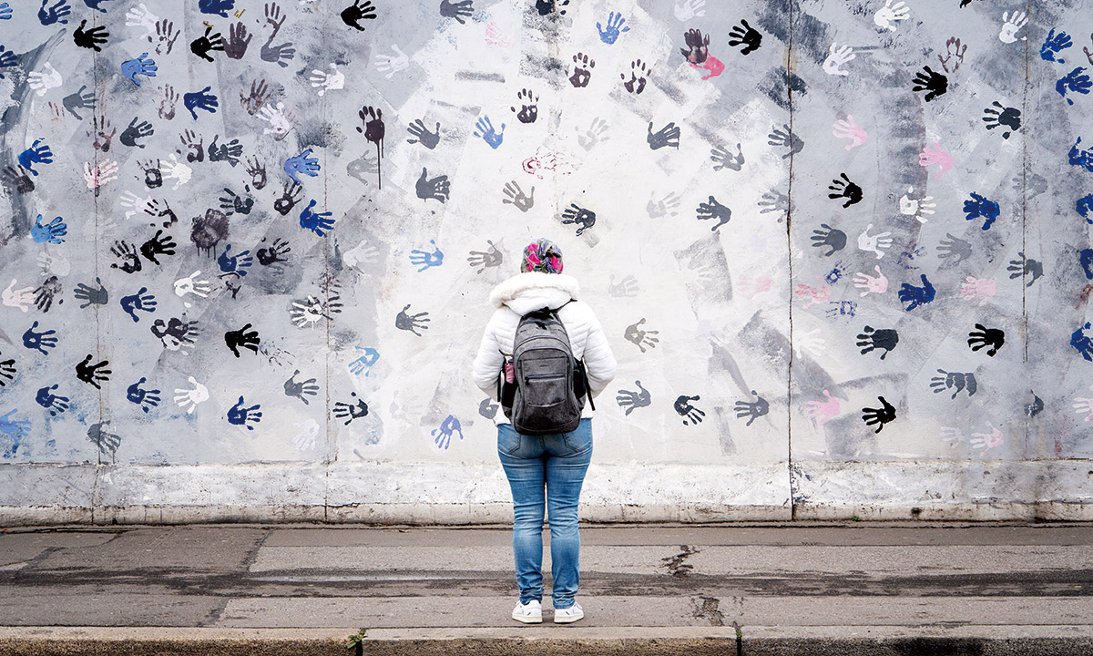 오늘날까지 남아 남북 분단의 흔적을 전하는 베를린 장벽과 그 앞에 선 시민의 모습