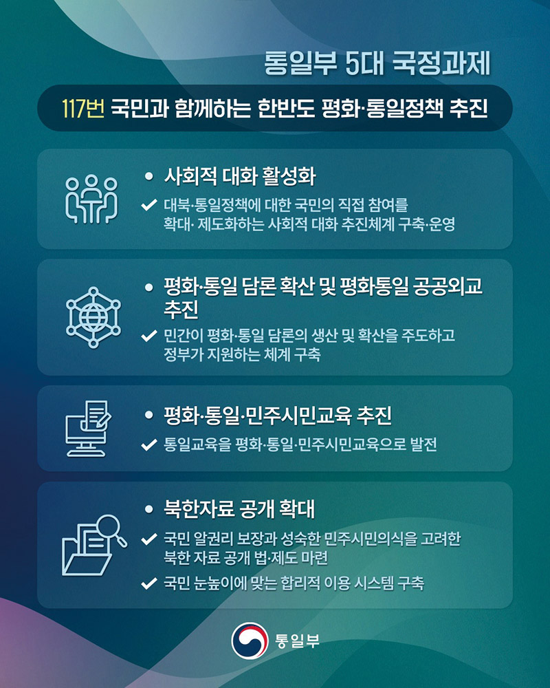 이를 실현하기 위해 정부는 「국민과 함께하는 한반도 평화·통일정책 추진」을 통해 세 가지 방향을 제시했다.
