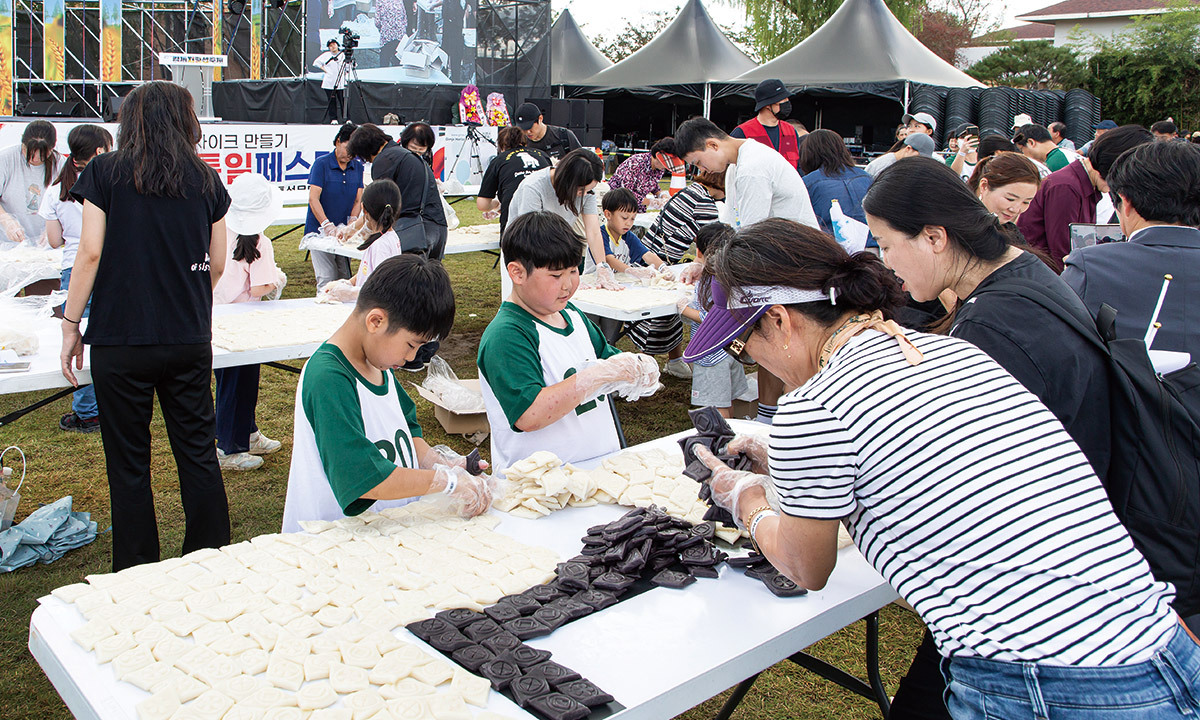 참가자들이 담소를 나누는 가운데에도 분주한 손놀림으로 절편을 이어 붙이자, 30여 분 만에 거의 모든 모자이크가 완성됐다. 자신의 테이블을 빈틈없이 꽉 채운 참가자들은 재료가 부족한 인근 테이블에 남은 절편과 농산물을 전달하고 일손을 보태기도 하며 ‘평화와 통일을 위해 하나 되자’는 이번 행사의 취지를 몸소 실천했다.
