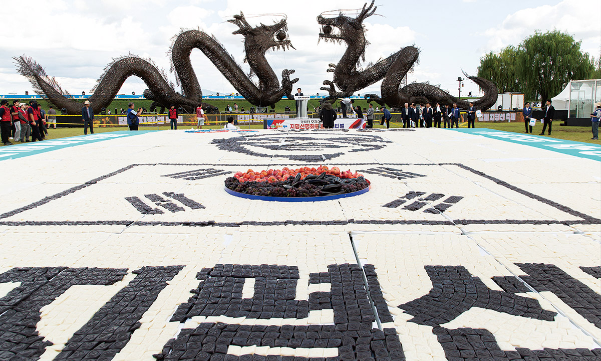 지평선쌀과 오색미로 만든 따끈따끈한 절편과 농산물이 모자이크 색깔에 맞춰 각 테이블에 전달됐다. 참가자들은 마치 기다렸다는 듯 포장을 풀고, 보기만 해도 맛있는 식재료로 테이블 위의 빈 공간을 채워 나갔다. 김제 농·특산물이 내뿜는 신선하고 구수한 향기가 사방으로 퍼지자, 바깥을 돌아다니던 관광객들이 금세 주변으로 모여들더니 구경에 나섰다. 지평선 평화통일 페스티벌이 성공을 향해 나아가고 있음을 상징하는 장면이었다.