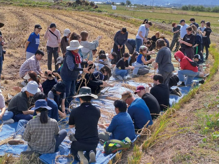 벼베기’ 행사에 참석한 독일 튀빙겐대학교 학생들이 벼 베기를 마친 후 새끼줄 꼬기 체험을 하고 있다. ⓒ철원군농민회 제공