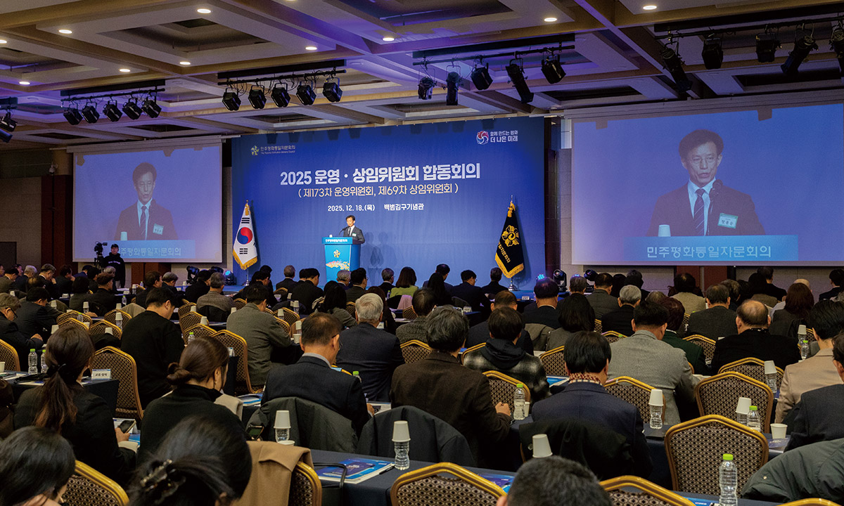 2025년 민주평통 운영·상임위원회 합동회의가 12월 18일 오후, 서울 백범김구기념관 컨벤션홀에서 개최됐다. 회의 시작이 가까워지자, 운영·상임위원들이 하나둘 자리를 채웠고 지난 한 해의 활동을 돌아보며 다음 해를 준비하는 논의가 이어질 채비를 갖췄다. 이번 회의는 「민주평화통일자문회의법」에 따라 개최되는 공식 회의로, 민주평통 제22기 출범 이후 2025년 정책 추진 상황을 점검하고 2026년 민주평통 운영 방향을 논의하기 위해 마련됐다. 회의에는 운영·상임위원과 관계자 등 약 500명이 참석해, ‘함께 만드는 평화, 더 나은 미래’를 향한 정책 논의를 이어갔다.