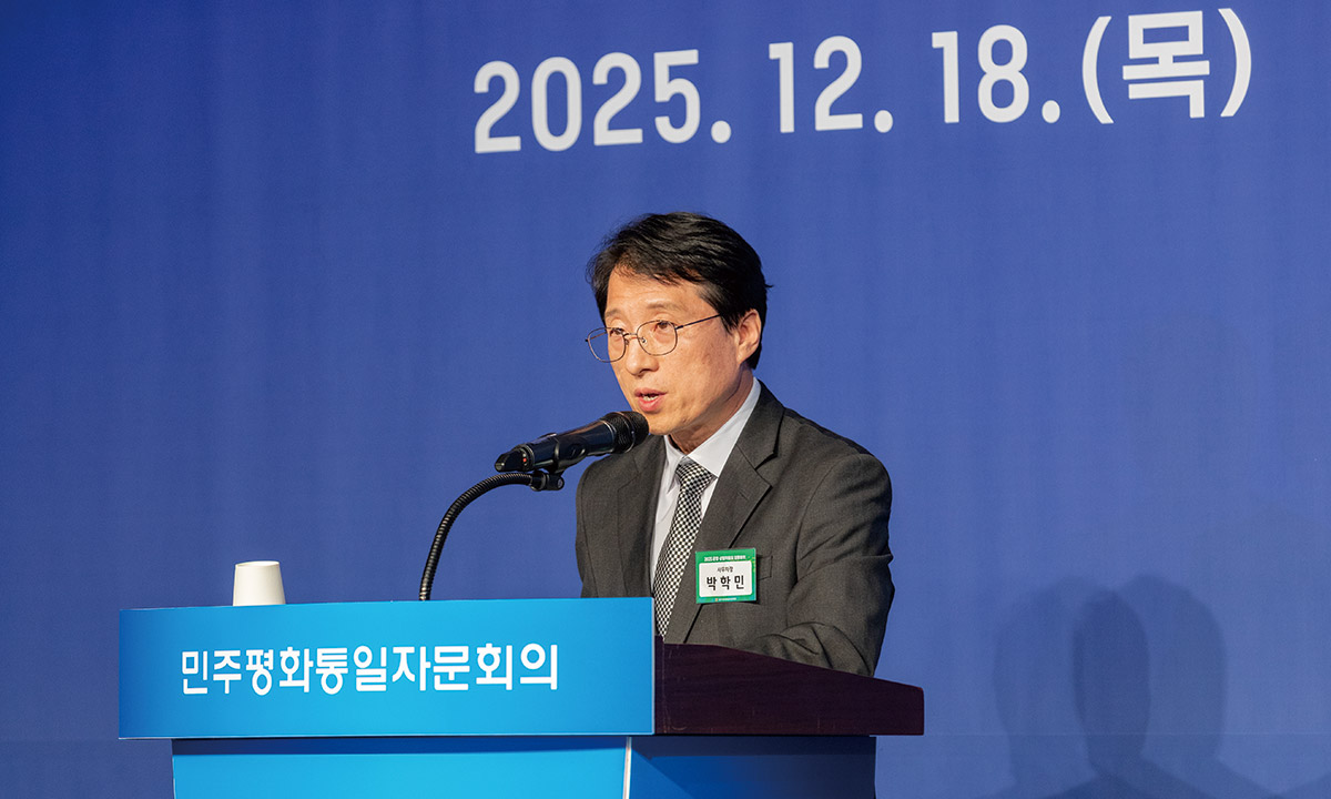 박학민 사무차장이 2025년 상임위원회에서 업무현황보고를 하고 있다. 통일의 다음 장을 향한 정책 건의