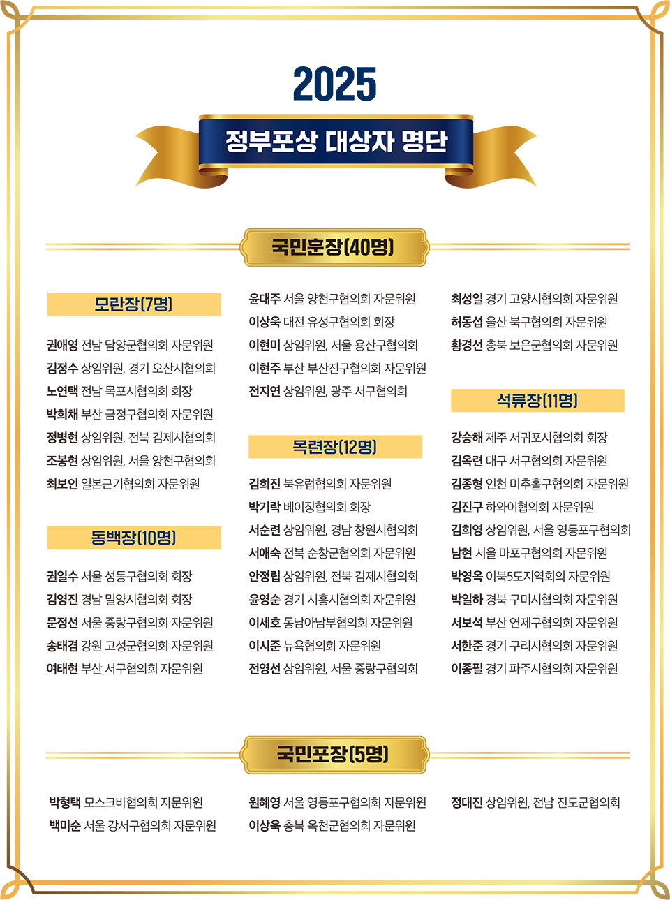 민주평통은 지난 12월 17일 14시 백범김구기념관에서 평화통일 기반 조성에 기여한 자문위원 45명(국내 38명, 해외 7명)에게 국민 훈·포장을 수여했다. 수상자는 훈격별로 모란장 7명, 동백장 10명, 목련장 12명, 석류장 11명, 국민포장 5명 등이다.